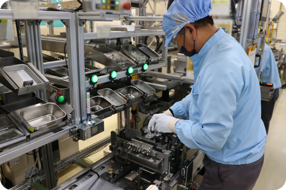 製品に糸くずや埃などが入らないように防塵服を着て、部品を組立てています。
