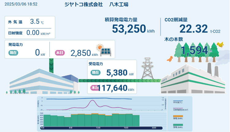 With the aim of raising carbon neutrality awareness, we set up apower consumption visualization system that shows the status of plant power consumption and a CO2 emissions visualization systemon our internal portal site.