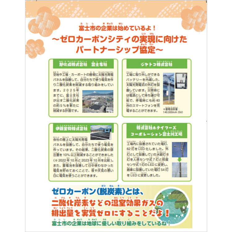 In October 2023, JATCO concluded a Partnership Agreement with Fuji City to realize the Fuji City Zero Carbon City initiative, which aims to achieve net-zero greenhouse gas emissions in Fuji City by2050. We report our greenhouse gas emission reduction targets and results to Fuji City. Additionally, JATCO’s activities are featured in Children’s Zero Carbon Challenge, an environmental awareness booklet distributed to fourth-grade elementary school students in the city.