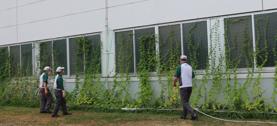 At our Yagi Area in Kyoto we are implementing a green curtain project by growing vines around the plant building to block direct sunlight. By using plants to block the sunlight, we are reducing the generation and penetration of radiant heat.