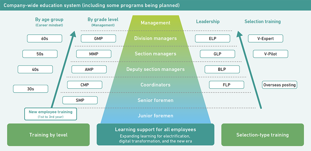 At JATCO, we have built a career development system based on two pillars: “role-based education” and “specialized education,” so that employees can acquire the behavioral characteristics, skills, and knowledge that lead to these outcomes.