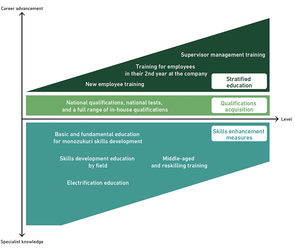 We have staged courses tailored to skill levels across job types so that employees can incrementally acquire techniques from monozukuri fundamentals to the specialized skills in each field and put them into practice at manufacturing sites. Furthermore, a similar kind of career development is being carried out at overseas offices as well.