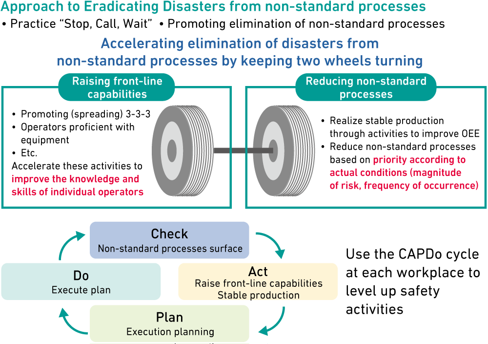 The plants have continued to take the lead in implementing safety activities based on Safety CAPDo*1 activities, but the situation is that accidents both requiring and not requiring time off work are continuing to occur.