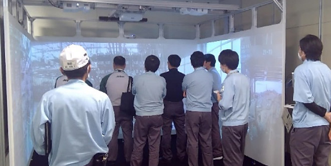 Furthermore, for accident/near miss cases that would entail danger if they were actually recreated, we have introduced a theater-style experiential education tool. This enables the trainees to experience danger in a virtual space, as if they were actually present and working in that space.