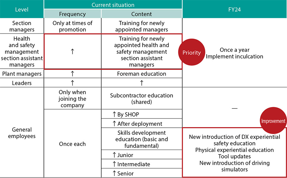 Section managers and also health and safety management section assistant managers, plant managers, and leaders are required to receive safety education once a year.