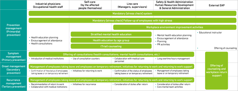 JATCO has developed mental health support measures for employees, managers and supervisors, occupational health staff, and the Human Resources Division, and is tackling the acquisition of and penetration of understanding of basic knowledge about mental health, knowledge about stress management (self-care), and knowledge about how to deal with subordinates (line care). Since FY2018, as one of its health management activities, the company has been implementing initiatives with a greater awareness of PDCA and approaches to the sense of psychological burden that comes with changes to and diversification of work styles, such as working from home.