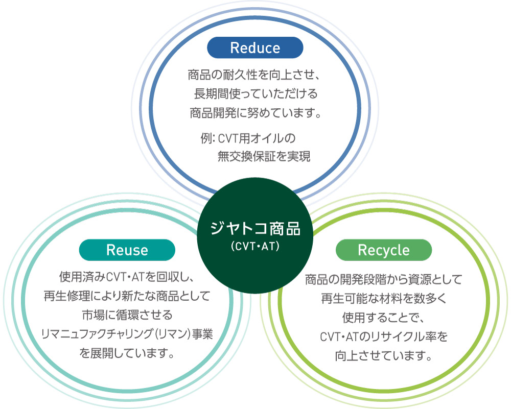 ジヤトコはモノづくり企業として、限りある資源を有効に活用することが大切だと考えています。以前より、使用済みとなった当社製CVT・ATを回収し、再生して再利用するリマニュファクチャリングを推進してきました。今後は、さらなるサーキュラーエコノミー推進にも力を入れていきます。具体的には、3R(Reduce・Reuse・Recycle)のアプローチを軸に取り組みを進めています。商品を長く使っていただけるように設計開発することで廃棄物を減らし(Reduce)、市場から回収された製品の中からまだ使える部品は再生利用し(Reuse)、再生可能な材料を活用して新たな資源へ再生化(Recycle)することで、資源依存の最小化と廃棄物の削減を実現し、製品および事業活動全体においてサーキュラーエコノミーの効果的な仕組みの構築に取り組んでいきます。