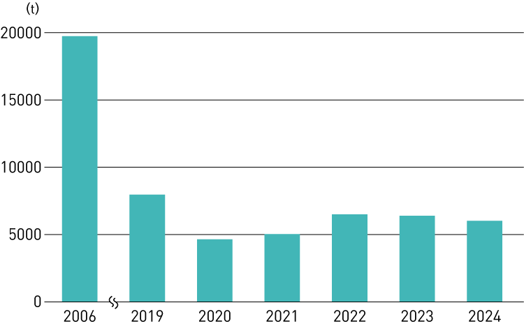 各事業所で廃棄物総量削減の目標を立て、各職場が実施した取り組みのアイデアを登録することで、廃棄物削減情報の共有化と職場ごとのモチベーションの向上を図っています。2024年の廃棄物量は、5,999t で2006年に対し69.7% 削減されました。