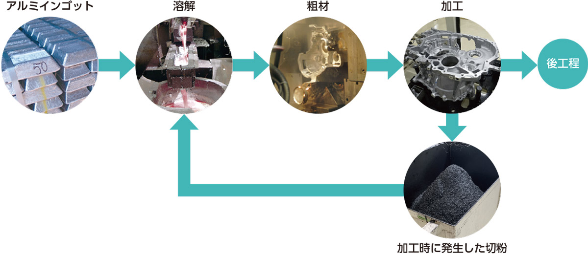 生産過程においてアルミ粗材を切削加工する際、アルミの削りカス=切粉が発生します。