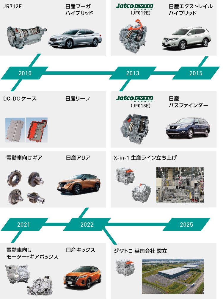 ジヤトコはCVT・ATのメーカーとしてこれまで1億3,000万台以上の製品を世に送り込んできました。一方で、10年以上前から電動化時代に備えてノウハウを積み重ねてきました。2010年に世界で初めて1モーター2クラッチシステムを採用したFR ハイブリッド車用トランスミッション、JR712Eを開発。さらに、電動車向けのモーターやギアボックスの供給も開始しました。2025年からはギア・モーター・インバーターを一体化したX-in-1の市場投入のため、英国に欧州では初となる生産拠点の設立、富士地区での生産ラインも立ち上げました。今後も競争力のある電動パワートレインの開発・製造により、脱炭素社会の実現に貢献します。