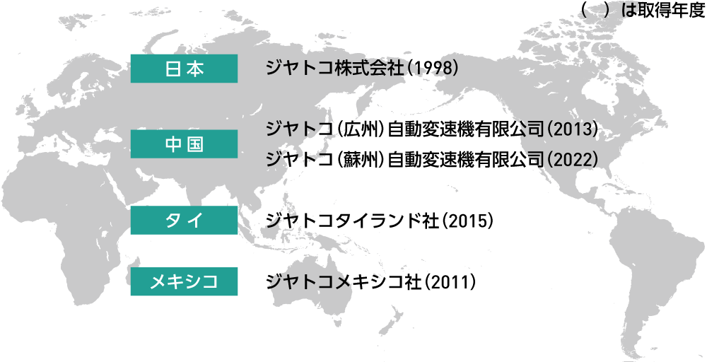 ジヤトコは、国内外のすべての生産拠点で、環境マネジメントシステムの最新規格である「ISO14001:2015版」を取得しています。ジヤトコがグローバルに展開する生産拠点では、環境への負荷を最小限に抑えるために、日本の生産拠点と同様の環境保全策を展開しながら、各拠点独自のアイデアも積極的に実施しています。これからも環境への影響を抑えた生産を、世界の拠点で展開していきます。