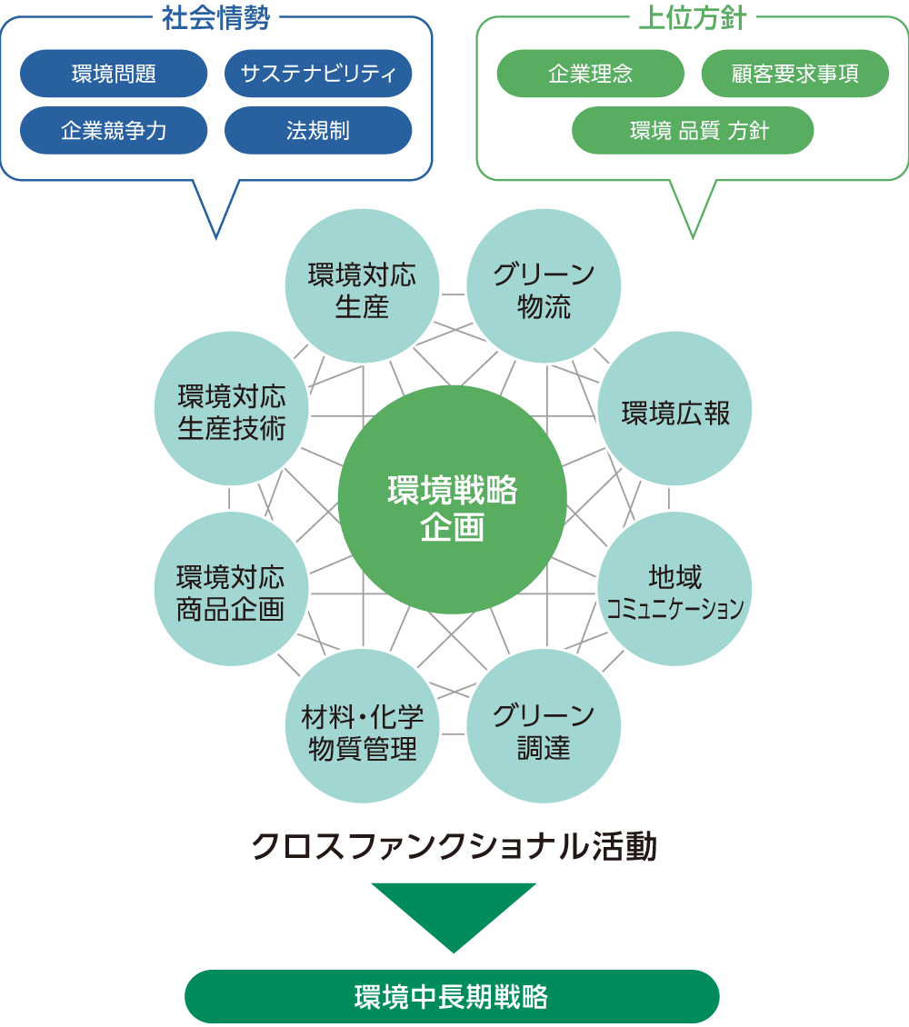 地区ごとの環境マネジメントを行う、EMS の推進と並行して、中長期の環境課題への取り組みも進めています。社会情勢や事業環境の変化、企業理念や各種上位方針などとの関連において、ジヤトコが取り組むべき環境課題について、現状把握、リスク分析、必要なアクションの検討を行い、実行につなげます。個々の課題について、ジヤトコ全体を俯瞰しながら、社内を横断した企画・マネジメントを実施しています。また、海外拠点での環境活動の企画・マネジメントなども連携しながら推進しています。