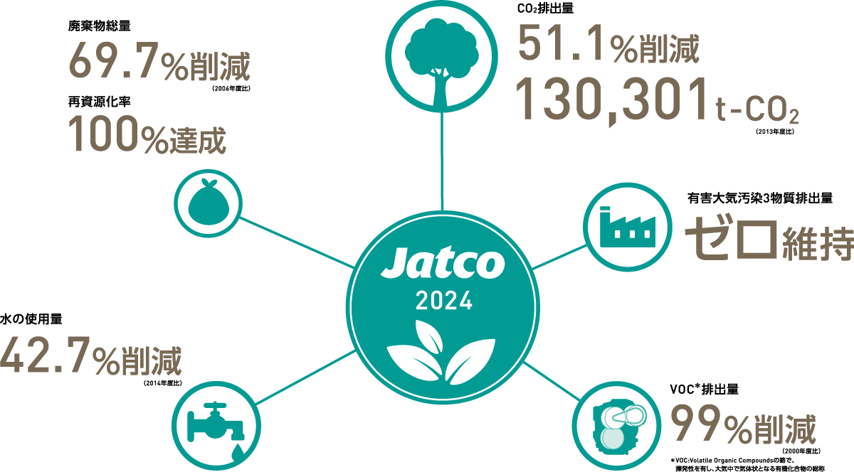 ジヤトコは年度ごとに環境負荷低減のための取り組み事項を「環境目標」として掲げ、その実現を目指しています。また、毎年度の取り組み結果を踏まえ、次年度以降の目標を設定することで、環境パフォーマンスの継続的改善を図っています。2024年度は環境関連の重大な法令違反や条例違反による行政処分は受けていませんが、社内で必要な措置と検討を行いました。